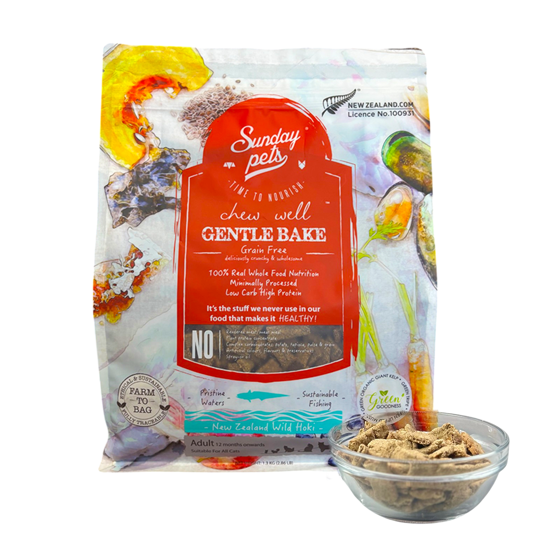 ニュージーランドの自然な海で育ったホキを主原料とし、穀類を使用せず低温で丁寧に焼き上げたグレインフリーフードです。